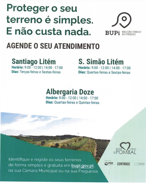 Antes de efetuar o registo, deverá identificar os terrenos que são seus num dos balcões BUPi disponíveis na União de Freguesias de Santiago e S. Simão de Litém e Albergaria dos Doze nos seguintes locais e horários: